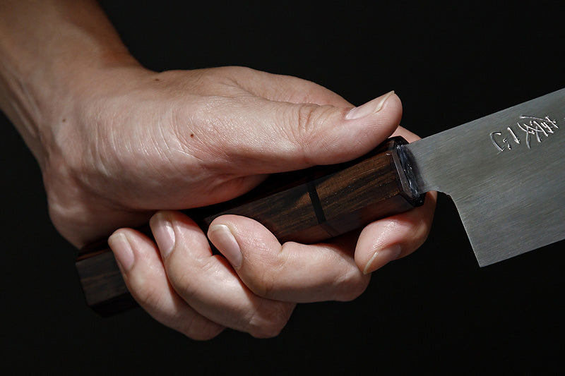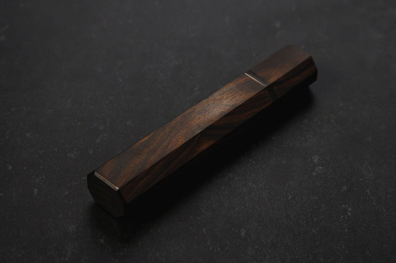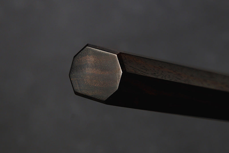 The handle of Katana Knives is made from the rare, premium wood Macassar Ebony. Hard and highly durable, polishing brings out its deep, lustrous shine. Its elegant grain shines in the seamless, ferrule-free design, naturally enhancing the blade’s beauty. The octagonal handle fits comfortably in the hand, providing a secure, slip-resistant grip, while a black resin ring adds a sophisticated accent.