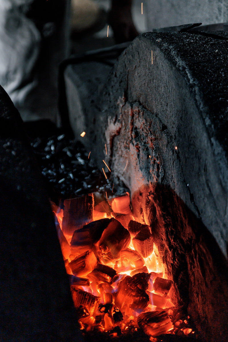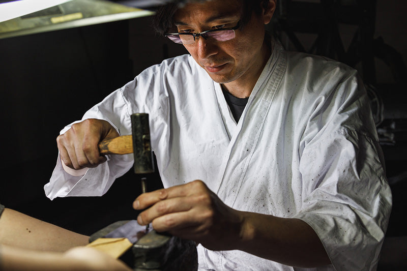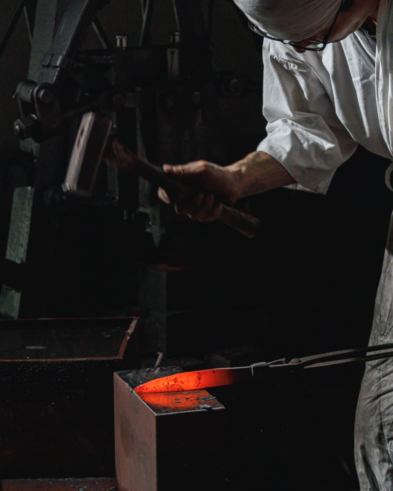 The forged tamahagane is reheated in the forge and stretched out roughly. The tip of the knife is shaped first, then the body is drawn out. Finally, the red-hot steel is carefully hammered with a mallet, gradually refining the form of the knife from the edge outward.