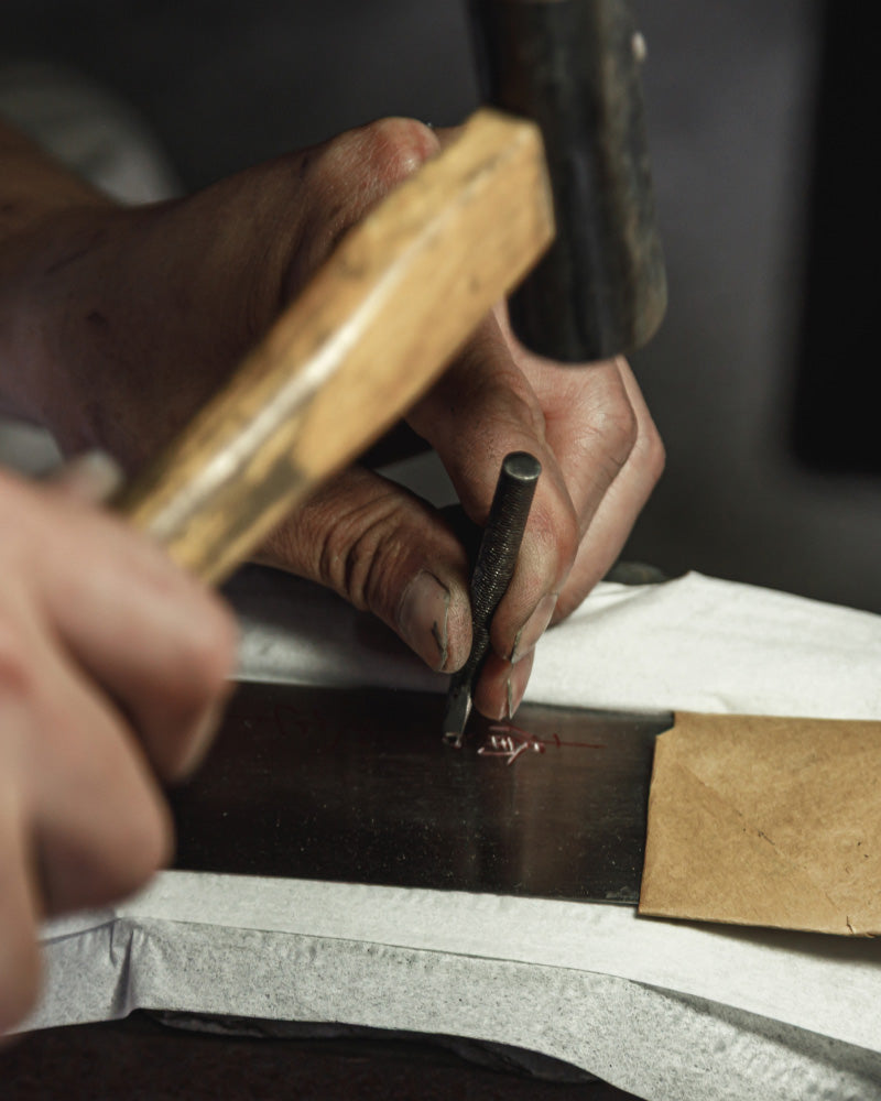 The tang, or nakago, at the base of the blade is heated, ready for the handle to be fitted by hand. Finally comes the mei-kiri—the maker’s signature, engraved on the knife. Tomioka Yoshimasa carefully inscribes “Bitchū Yoshimasa,” kanji by kanji, marking the polished blade with his name. With this final step, ‘Katana Knives’ is complete.