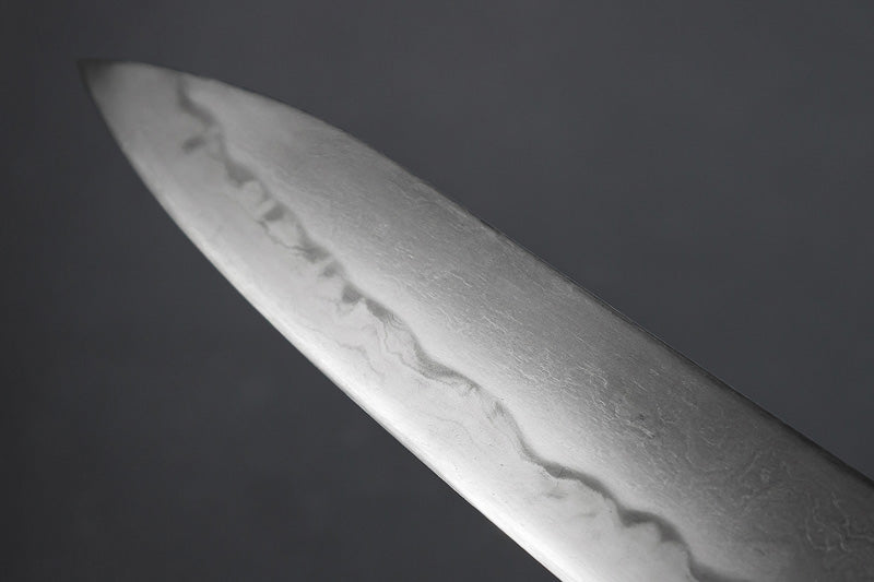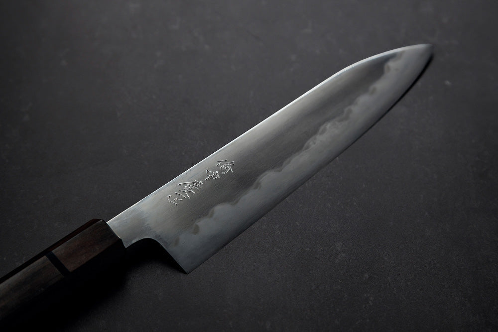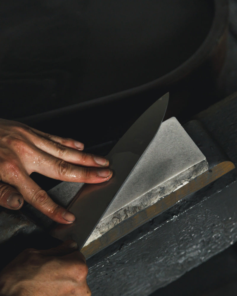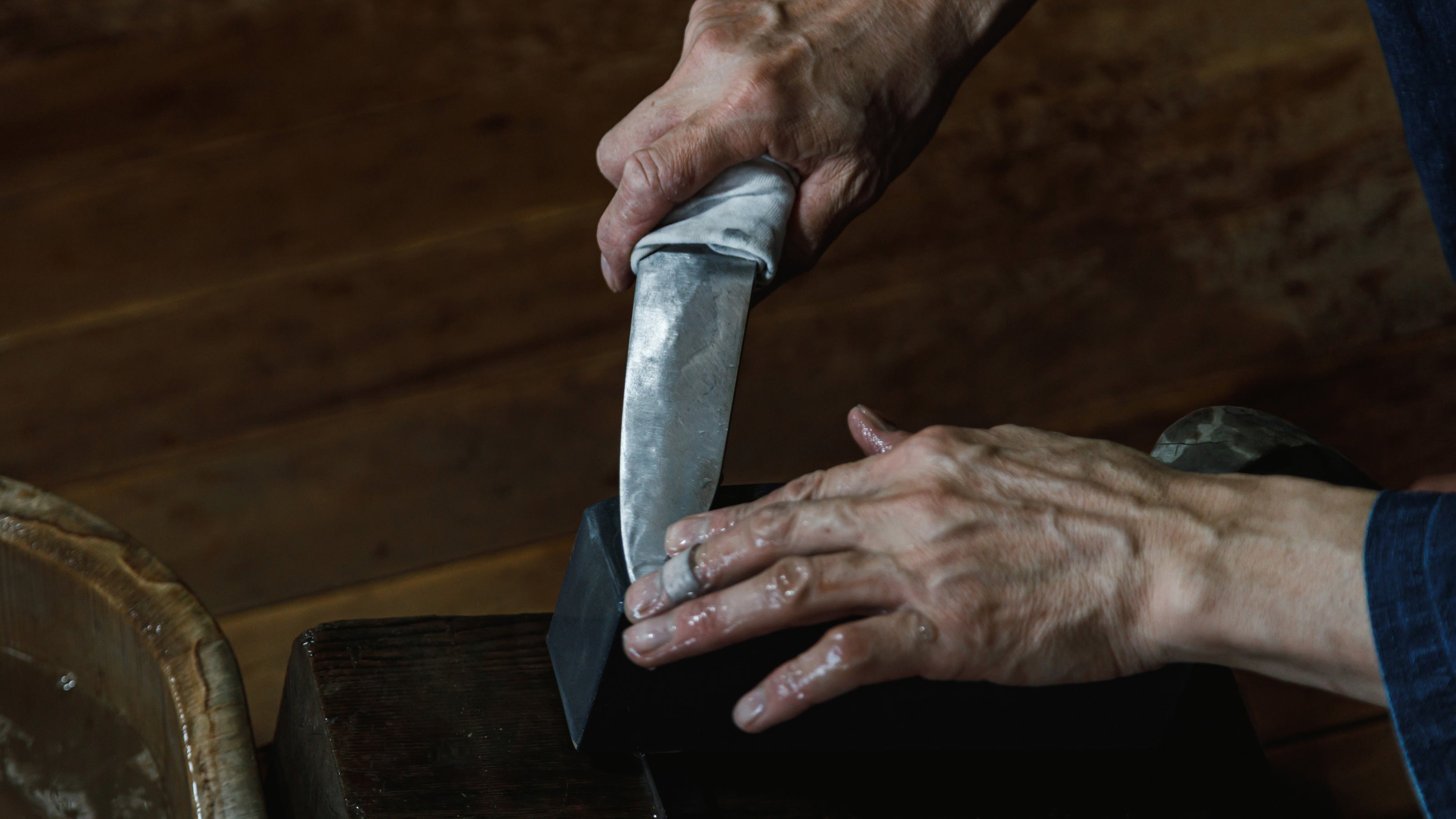 The swordsmith performs a rough polish, checking the state of the knife and making fine adjustments to its form and thickness. The blade is then entrusted to a professional Japanese sword polisher, known as a togishi. With a delicate touch and refined skill, the polisher brings out the knife’s sharpness and beauty. Over many hours, working through a range of whetstones, the polisher enhances the blade’s luster—highlighting the hamon and grain to give the blade its distinctive brilliance.