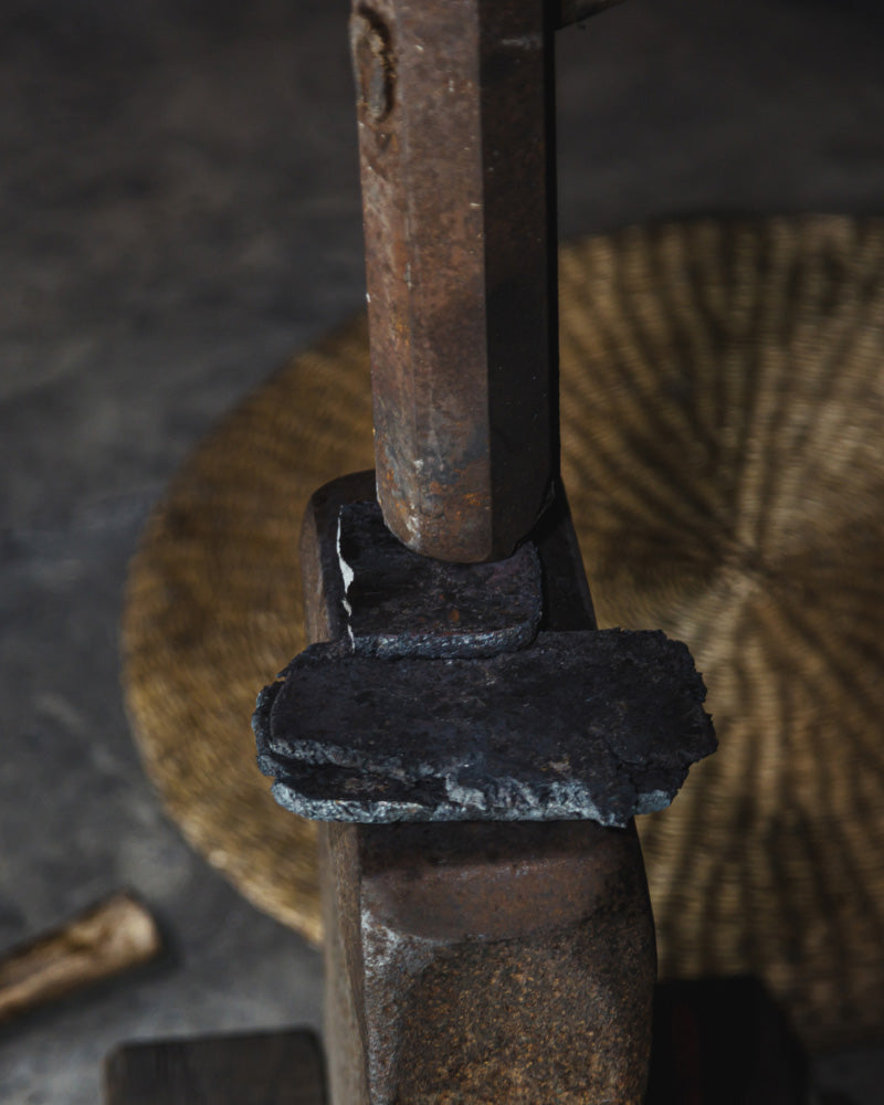 First, the heated tamahagane is hammered to consolidate the raw steel. Next, it is broken into smaller pieces, sorted, stacked, and returned to the forge, where the steel fuses together. The fused mass is reheated to burn off impurities, then powerfully hammered, flattened, scored, folded, and restacked. Repeating this process evens out the carbon content, producing a resilient steel with countless overlapping layers.