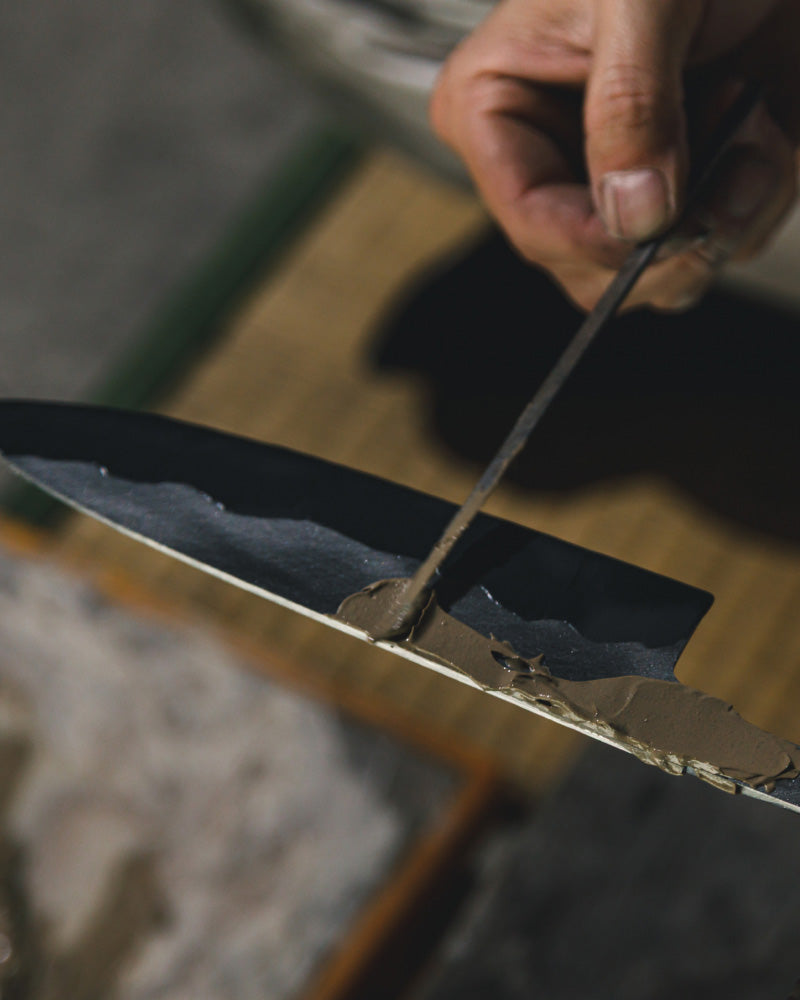 After refining the knife’s shape and surface with files, tsuchioki—clay coating—is applied to the blade. This essential step determines the appearance of the hamon, the blade's artful temper line. The entire knife is then heated in the forge while carefully judging the temperature in the darkness. Once removed, the knife is plunged into water for rapid cooling. This quenching process, like tsuchioki, allows no second chances—it is the moment when life is breathed into the blade.